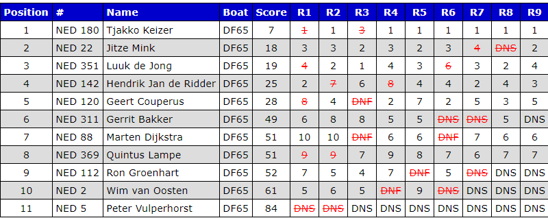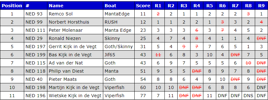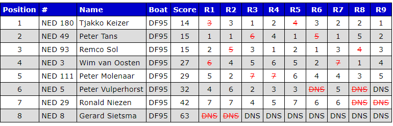 Tja.. en dan de uitslag! Van iedere winnaar per klasse werd er gestreden in de alles beslissende race met de DF95 om de wisselbokaal. Allen gelijk qua boot en zeil.