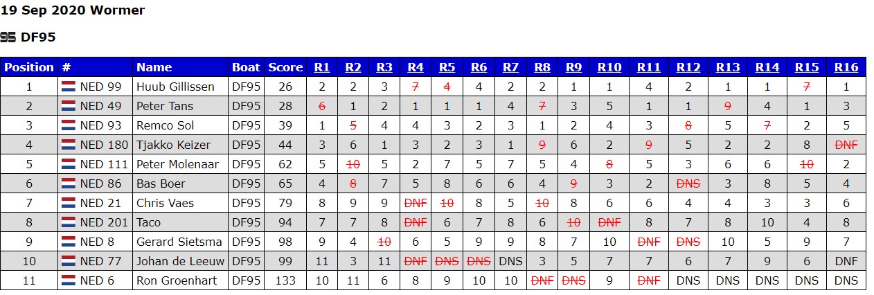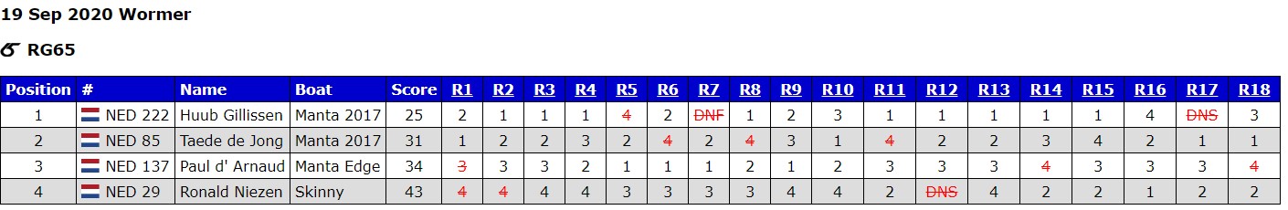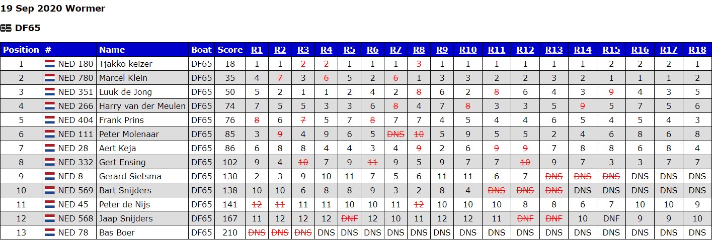 Na 18 wedstrijden mocht Huub Gillissen zich wederom winnaar noemen, maar nu bij de RG65 en Tjakko Keizer bij de DF65. Speciale vermelding voor Luuk de Jong op de 3e plaats die 1e werd in de club klasse (alleen met standaard tuig ingeschreven en gevaren).