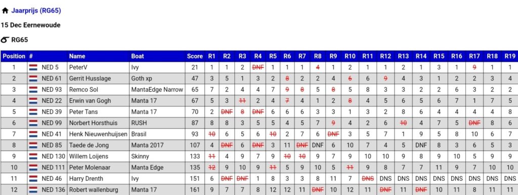 De winnaar schrijft en de nummer 2 noemt de zeilnummers op de finishlijn. Na elke race een andere zeiler die op de lijn meekijkt en de zeilers aanroept bij te vroege start. ( let op, dit alles kan bij niet al te grote aantallen zeilers) zonder mokken werd hier keurig op gereageerd.