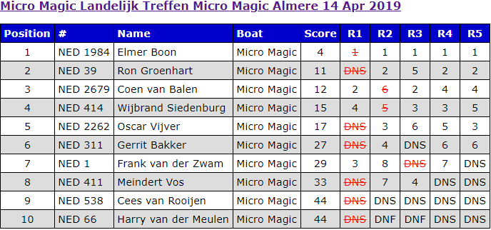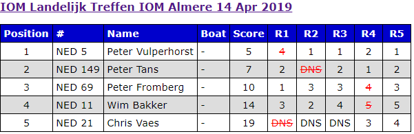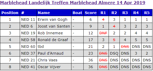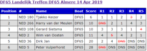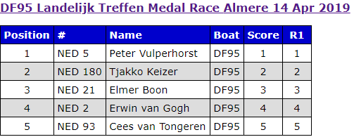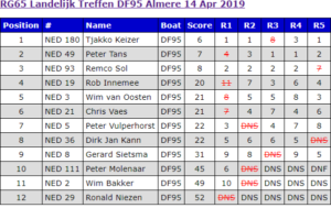 Met een koude start werd het een mooie dag met een matige wind uit het oosten en werden 5 races gezeild en een medalrace tussen de winnaars. De winnaars zeilde met een DF95 die ter beschikking werd gesteld door de diverse eigenaren.