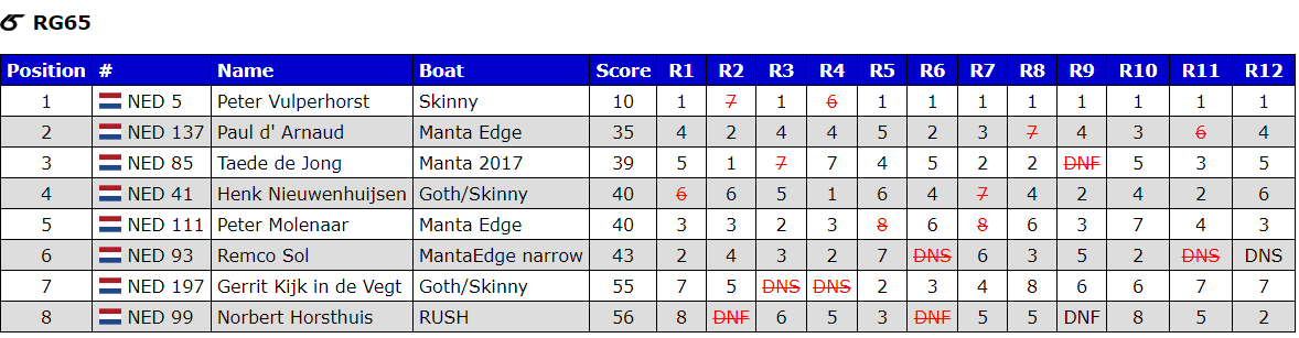 Vanwege de harde wind en de smallere baan in de binnenhaven is er besloten om de DF65 en RG65 apart in aparte heats te varen, en dan meteen 2 heats achter elkaar varen om zo minder beweging op de steigers te hebben. Dit systeem beviel heel erg goed, en en gaf ook de mogelijkheid om elkaar te helpen met tips en bij het finishen, waarvoor nog heel veel dank: Sylvia…