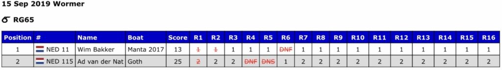 Ondanks het perfect zeilweer en locatie waren er in totaal maar 10 deelnemers, waarvan slechts twee met een RG65 en acht met een DF65.